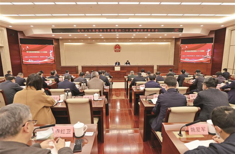 深入学习宣传贯彻党的二十大精神。市人大常委会机关举行全市人大系统学习贯彻党的二十大精神宣讲报告会,坚决把思想和行动统一到党的二十大精神上来,把智慧和力量凝聚到党的二十大确定的各项目标任务上来,在坚定扞卫“两个确立”、坚决做到“两个维护”上当好表率。